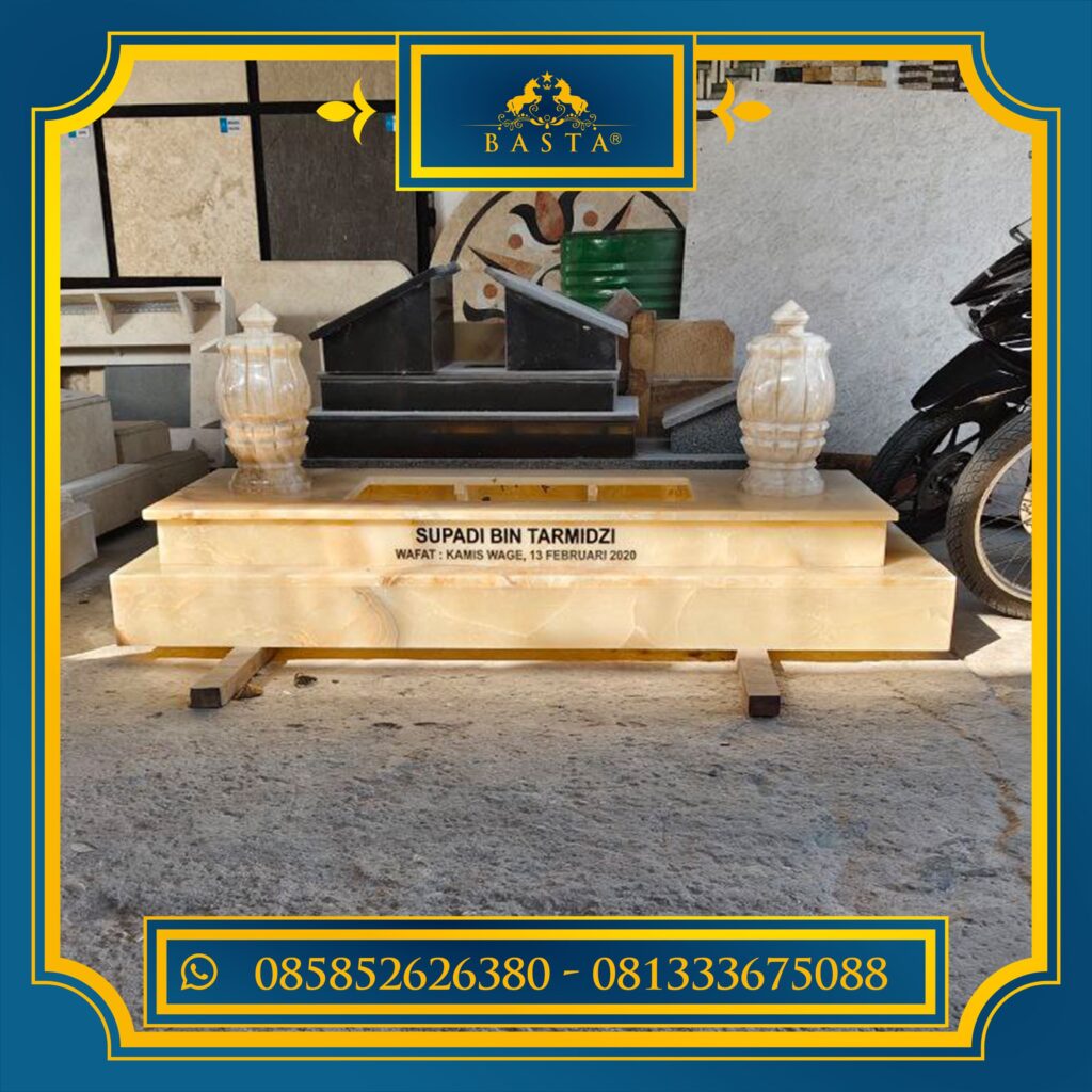 Kijing makam onyx adalah penutup makam yang terbuat dari batu onyx alami, salah satu jenis batu alam mewah yang dikenal akan keindahannya. Tidak seperti batu biasa, batu onyx memiliki karakteristik unik, struktur semi-transparan yang memungkinkan cahaya menembus permukaannya. Efek ini memberikan kesan ajaib, apalagi jika diberi pencahayaan dari bawah atau dalam, menghasilkan sinar lembut yang memesona.